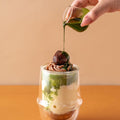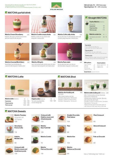 ATELIER MATCHAのシグネチャーメニュー、山政小山園の「小倉山」を使用した銀座スタイルに加えて、抹茶3種類(小倉山、さみどり、天王山)、ミルク5種類(ミルク、ローファットミルク、オーツ、豆乳、ココナツミルク)、甘さ4種類からお好きなラテにカスタマイズいただけます。